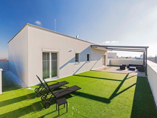 Luxusní zařízený penthouse 3+kk s extra velkou terasou 128 m2. Plně klimatizovaný byt v posledním patře komorní rezidence s výtahem přímo do bytu. Slunná terasa s elektrickou markýzou nabízí krásný výhled. Vestavěný nábytek na míru. Garážové stání, sklep a vybavení bytu součástí kupní ceny. ▪ ▪ ▪ ▪ Completely furnished luxury penthouse 3+kk with extra large terrace of 128 m2. Fully air-conditioned flat on the top floor of a small residence with a lift that opens directly to the unit. Sunny terrace with electrical sunblind and nice view. Made to measure built-in furniture. Garage parking, cellar and flat equipment included in the price. |